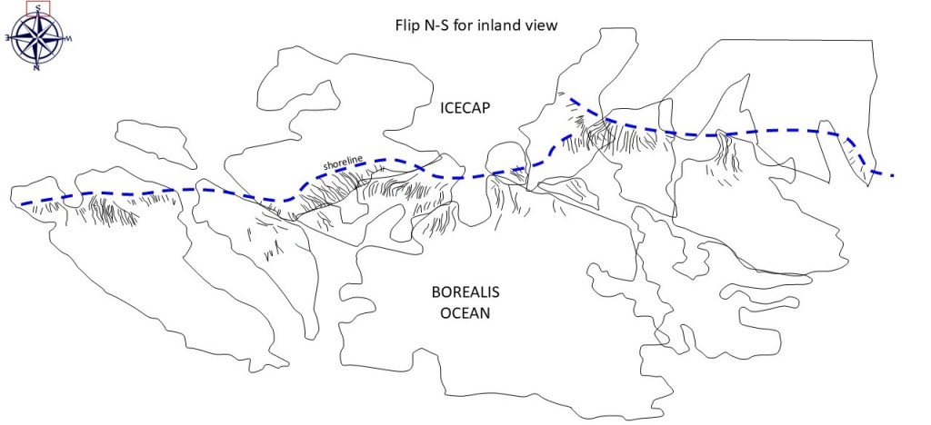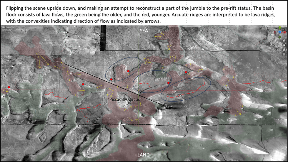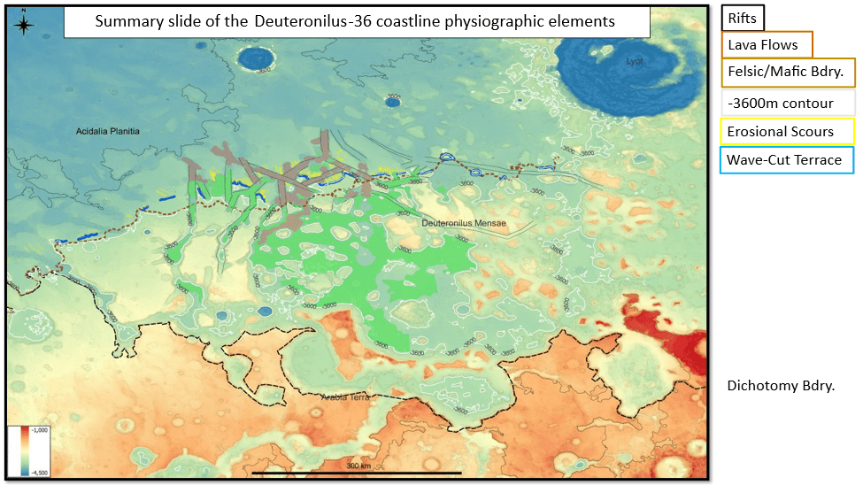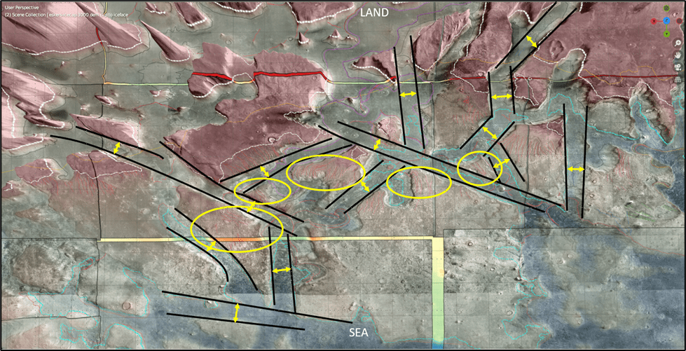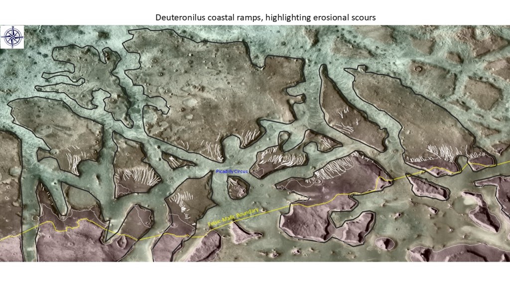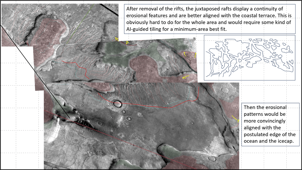 We’ve seen the erosional evidence of a -3600m sea level both on sea stacks and on an indented shoreline on ramps; a dip-oriented pattern of scours extending along ~850km strike of proposed shoreline, most likely due to glacial runoff (the only viable candidate for a line source that long); evidence of post-erosional rifting and associated lava flows.