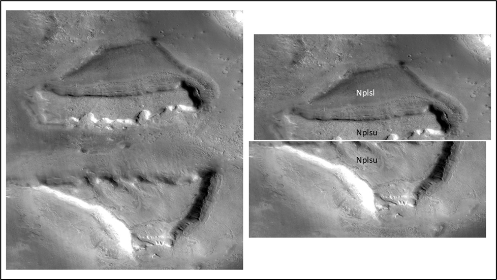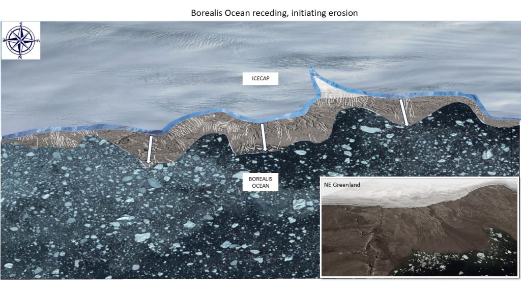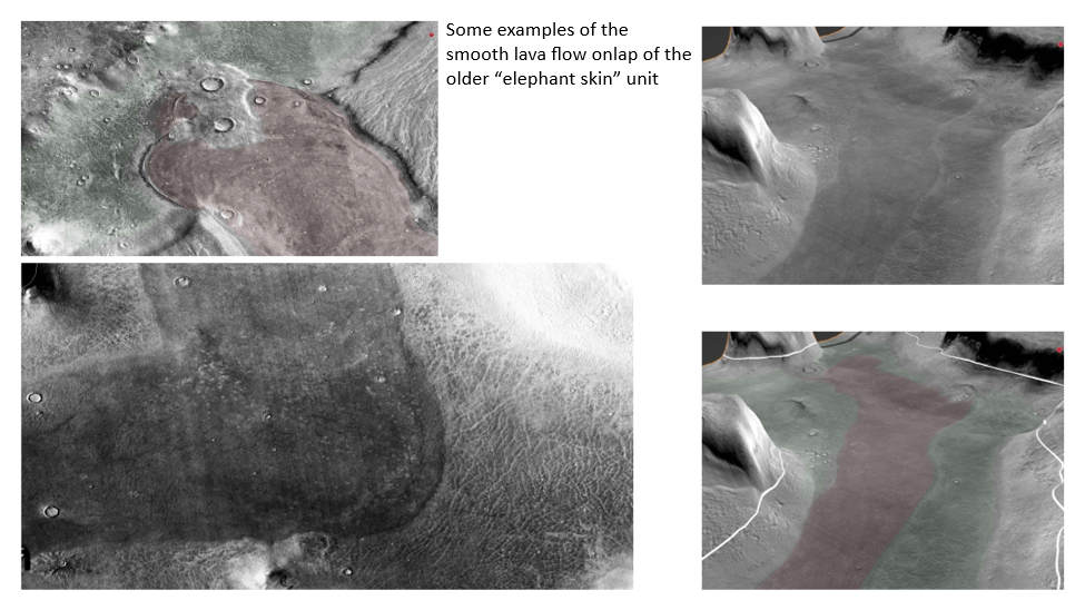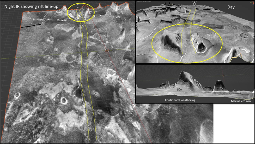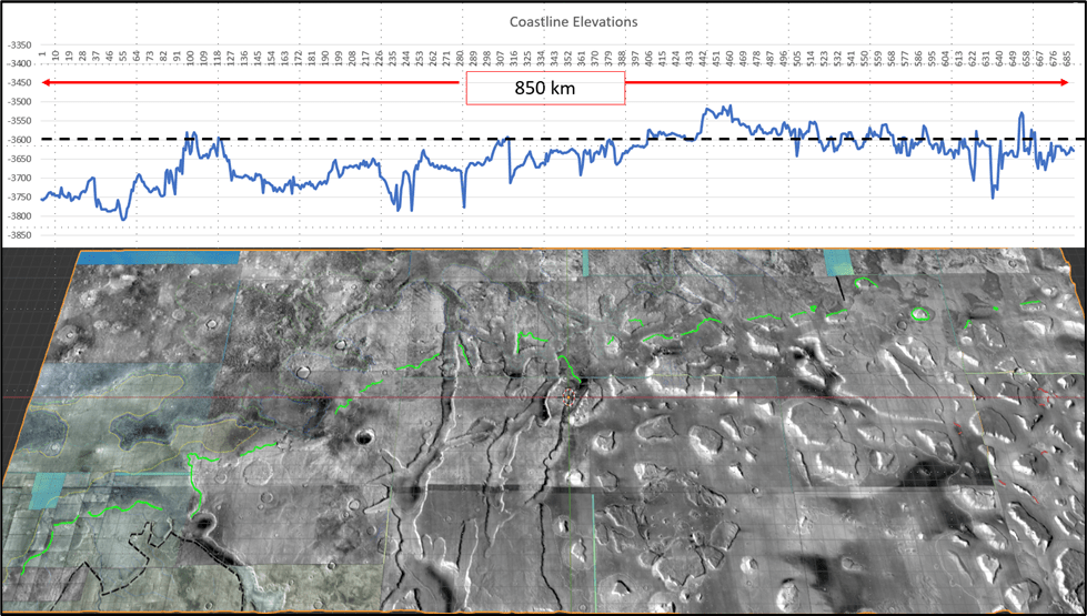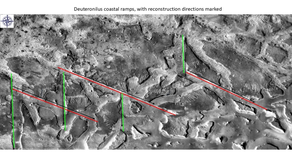 We’ve seen the erosional evidence of a -3600m sea level both on sea stacks and on an indented shoreline on ramps; a dip-oriented pattern of scours extending along ~850km strike of proposed shoreline, most likely due to glacial runoff (the only viable candidate for a line source that long); evidence of post-erosional rifting and associated lava flows.