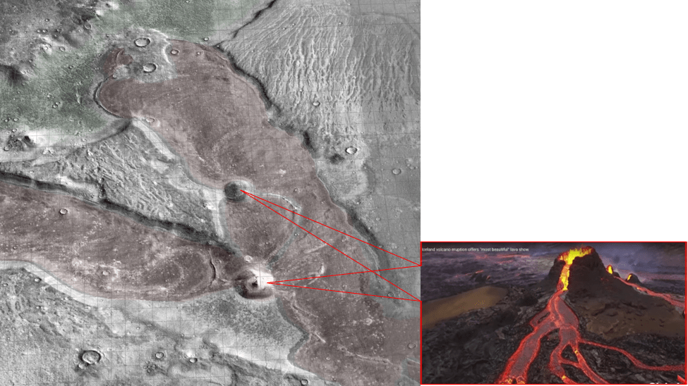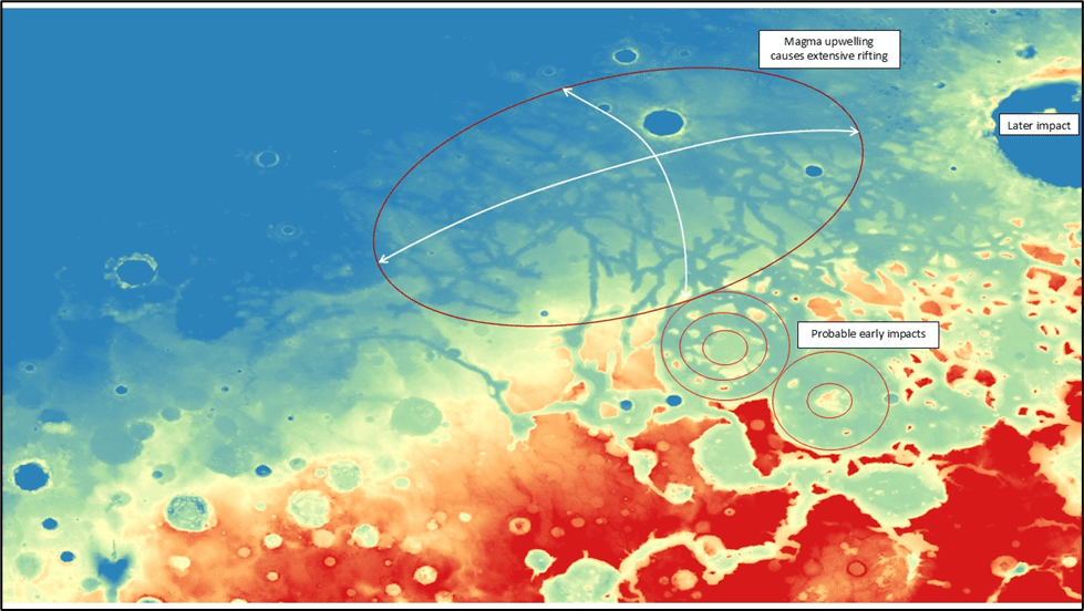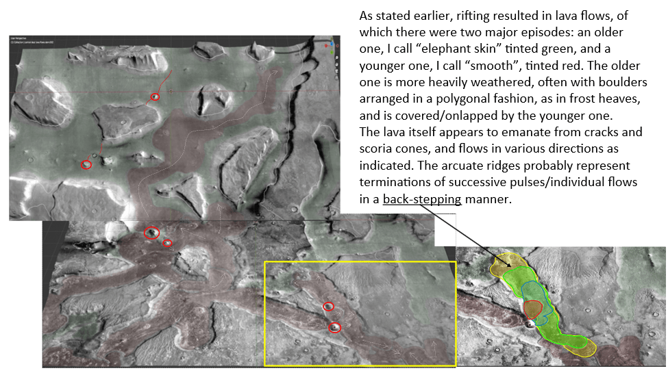Rifting was likely initiated by an uplift, such as by a mantle plume; this also gave rise to lava flows as evidenced by arcuate ridges and apparent cinder cone as will be shown in the next section.