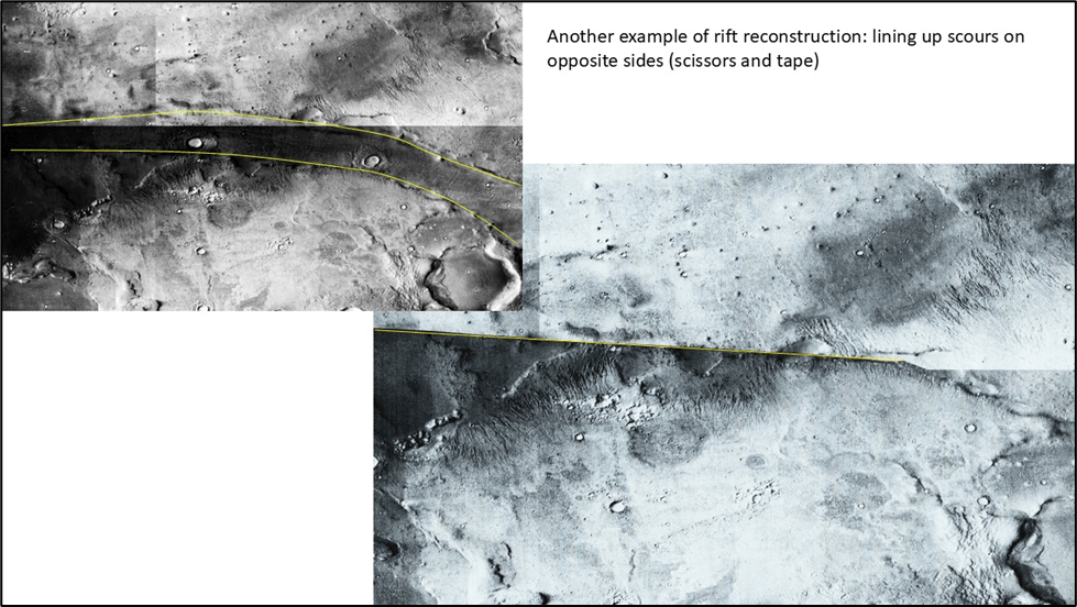 To restore the scoured rafts to their original pre-rift position would mean to simultaneously narrow all the rifts and juxtapose the opposite sides. A monumental task which could perhaps be undertaken by an AI-directed tiling program. Failing that, one might just try some “easy” cases, to prove the point.