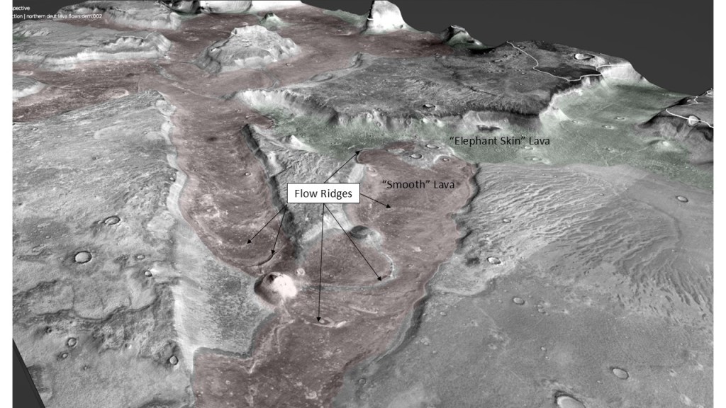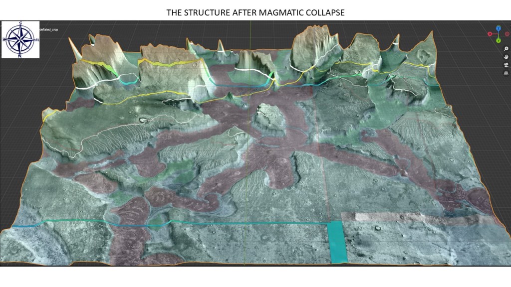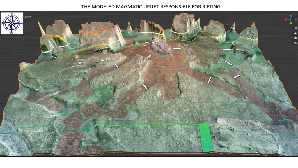 A bird’s-eye view reveals a pattern of rectilinear rifts which have broken up many of the mesas and ramps in the area, likely as a result of thermal (magmatic) uplift. Some suggestions have been made that these are glacial valleys, but neither are they U-shaped, nor is the terrain steep enough for glaciers to have moved much so I think rifting is the better model. The best explanation for this extensional rifting is a regional thermal doming: