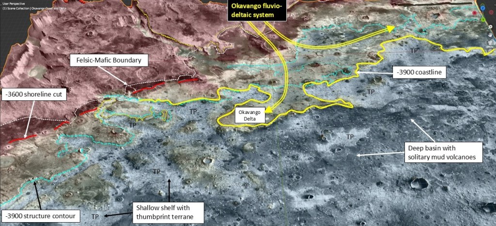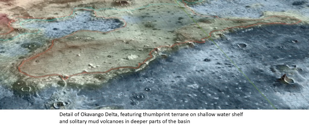 A snapshot of the NE end of Okavango Delta showing land, a shallow shelf with mud volcanoes and thumbprint terrane, and a pronounced shoreline