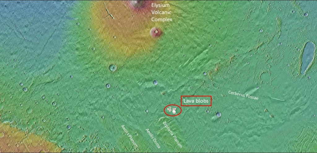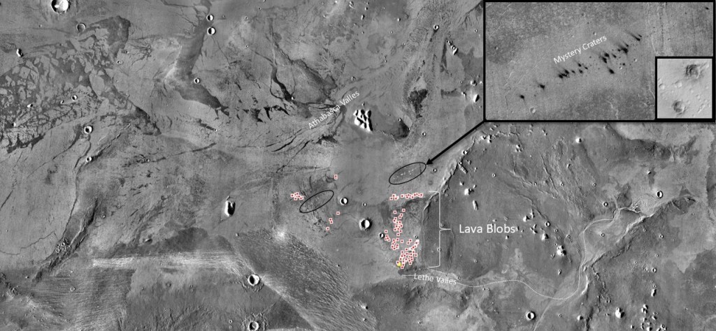 On the flank of the Elysium Volcanic Complex, amidst multi-directional lava flows, an enigmatic collection of lava blobs can be seen, seemingly plowing through fresh lava sheets and leaving bare tracks in their wake. Their location is shown on the following slide as clusters of squares, between Athabasca Valles and Lethe Vallis. A linear concentration of craters is also seen in the vicinity.