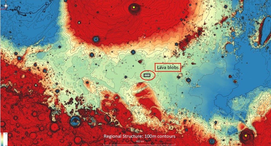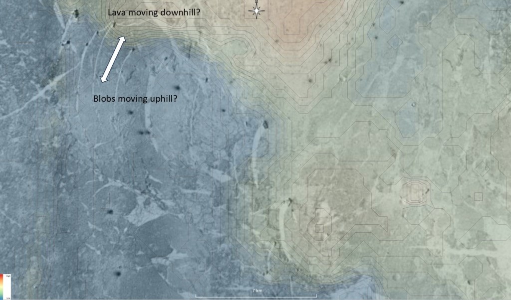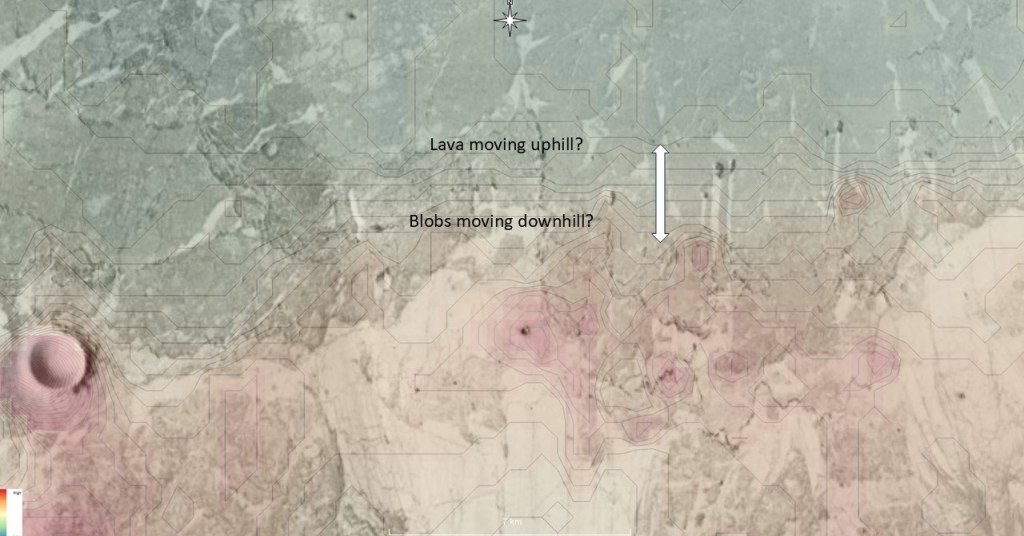 So what about topography? (red high-blue low, 1 meter contour interval) on the next slide is an argument for lava rather than blob movement, forgetting about the curved track for the moment.