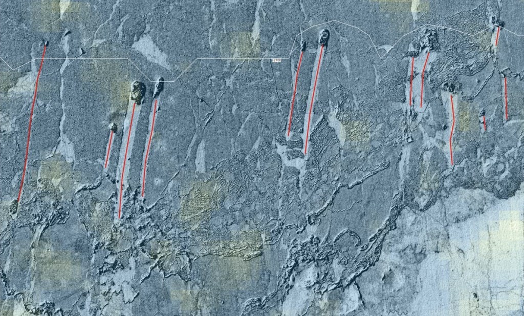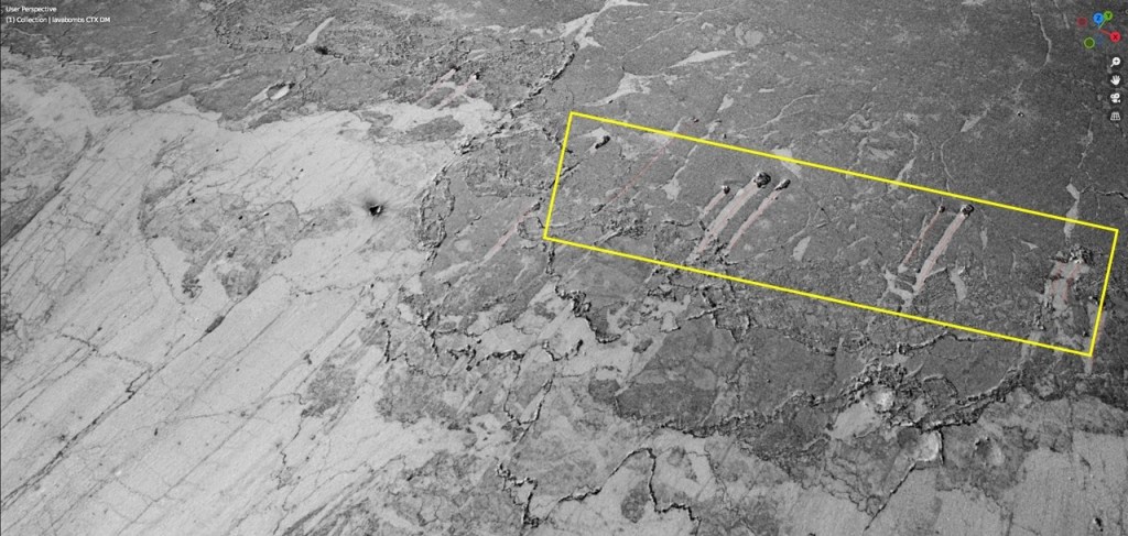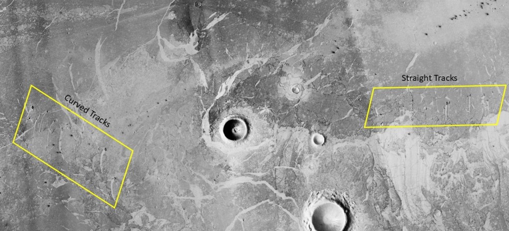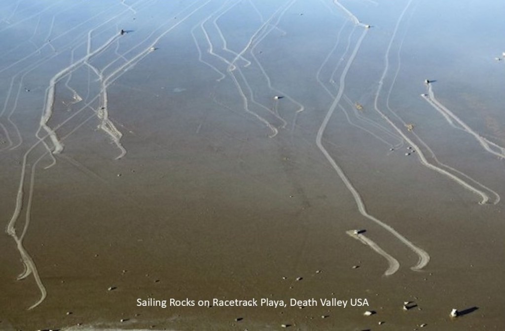 The idea of wind effects seems kind of far-fetched, considering the current thin atmosphere, but it might have been quite different in the Amazonian, maybe with a much thicker atmosphere and hurricane-force winds. The illustration below shows tracks made by sailing rocks in Death Valley. This required some admittedly special circumstances, such as a wet substrate, shallow water, a thin layer of floating pancake ice, and enough wind to push the ice against the rocks (weighing up to hundreds of kilograms). The tracks clearly show changes in wind direction.
