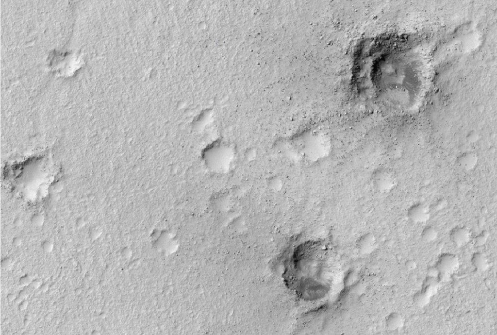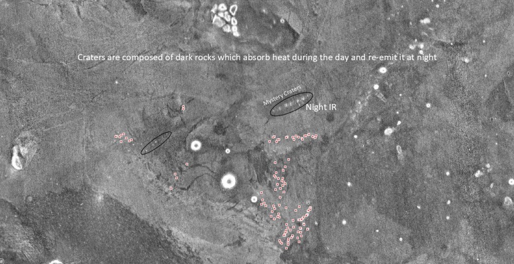 That leaves the remaining mystery, the linear alignment of craters. My guess is that they are aligned along a regional fault and are out-gassing volcanic gases, since they bring dark material to the surface (light on night infrared)