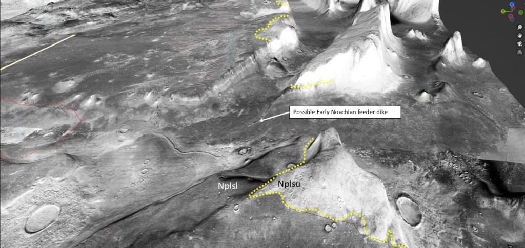 A brief review of the plateau rocks, mensae and ramps is in order. They are divided into two units: Noachian Plateau Smooth Upper and Noachian Plateau Smooth Lower distinguished by their reflectivity, i.e. light upper (felsic) and dark lower (mafic). As discussed in the previous section, the light upper unit, where eroded, reveals the stratigraphically lower dark unit.