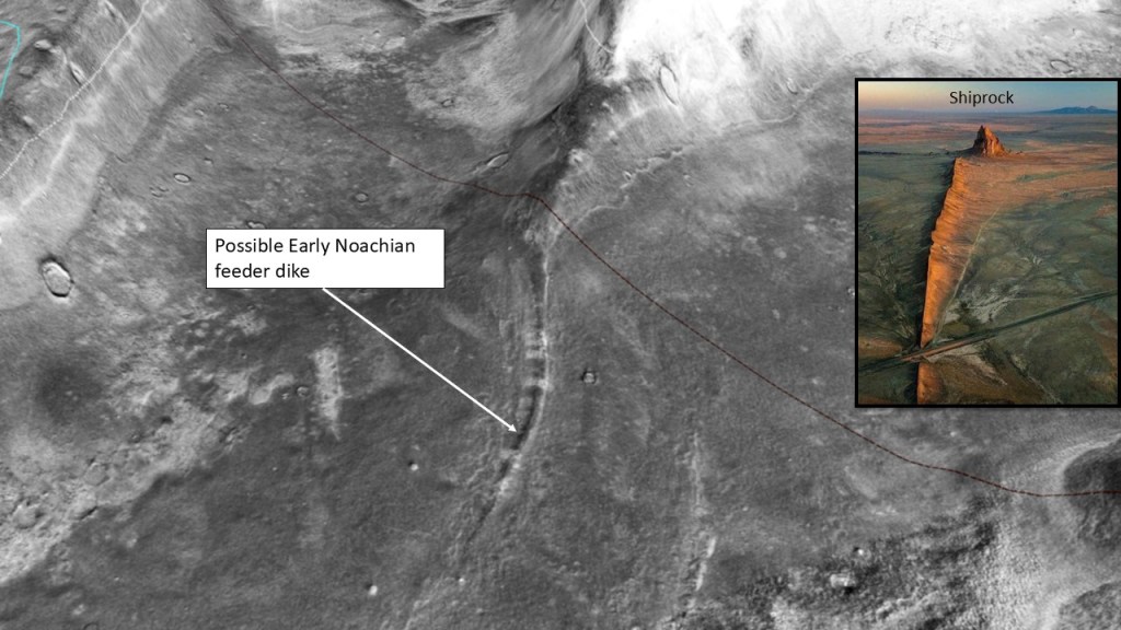 The yellow line demarcates the contact between upper and lower mesa units, and a possible feeder dike for the lower basalt is indicated: