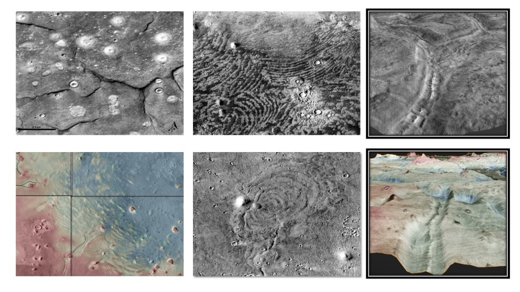 So where do we go for these types of rocks? For the fractured caprock, the other side of the planet gives some hints. Almost 180 degrees to the East lies Apollinaris Mons, and north of it a heavily fractured area called Avernus Colles. The main formation here is claimed to be composed of lava flows because of its platy appearance; however, there are areas containing yardangs nearby making them part of the more friable Medusae Fossae Formation, thought to represent airfall ash and dust from explosive eruptions. Whatever the lithology is, it lends itself to a very distinctive style of concentric fracturing which is reminiscent of conchoidal fractures in glass or flint or any fine-grained, amorphous material. Whatever the case, geometrically, the fracture patterns mirror the thumbprint terranes.