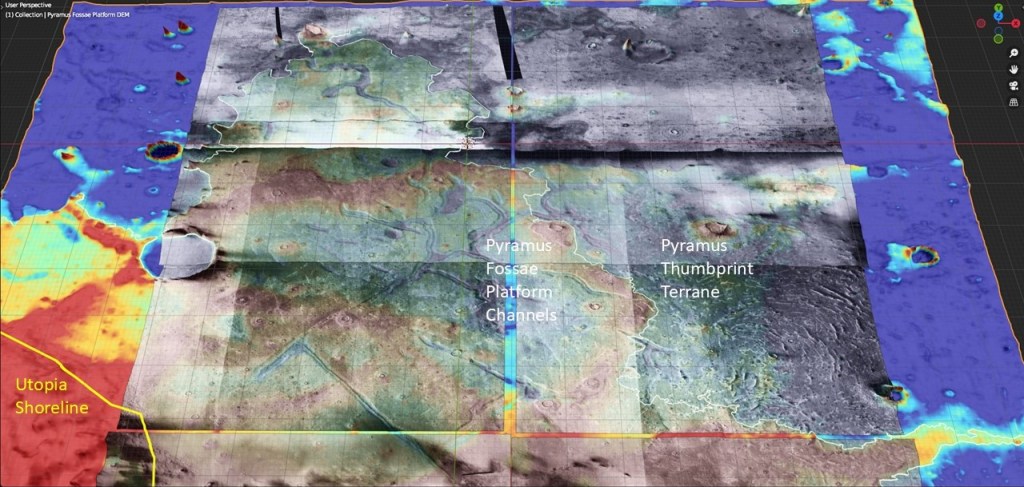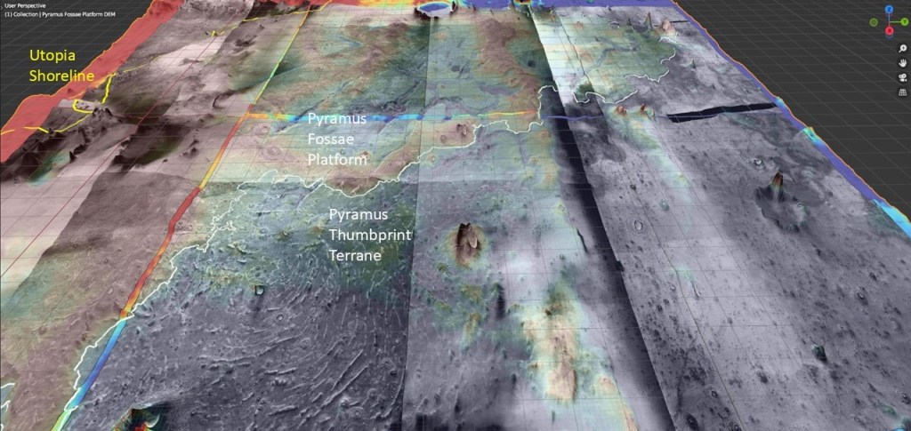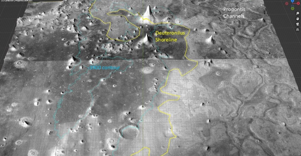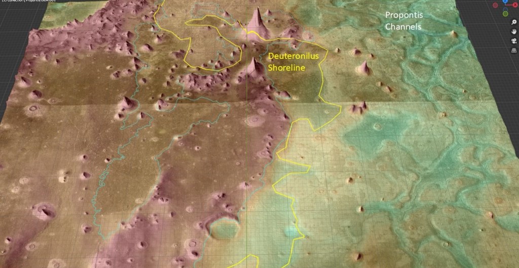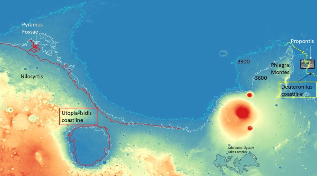 Pyramus Fossae are located North East of the Nilosyrtis region, just outboard of the -3600 (Utopia) shoreline; Propontis is East of Phlegra Montes, just outboard of the -3900 (Deuteronilus) shoreline.